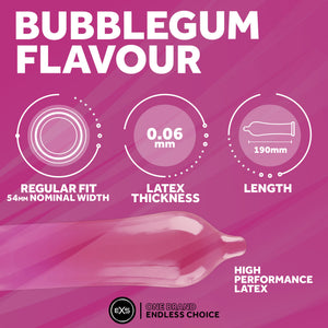 Add a playful twist to your intimate moments with EXS Flavoured Condoms. Designed for both safety and fun, these condoms offer reliable protection against unwanted pregnancies and sexually transmitted infections, including HIV, while infusing a hint of nostalgia with their delightful flavour of Cola, Bubblegum, Strawberry, and Chocolate.